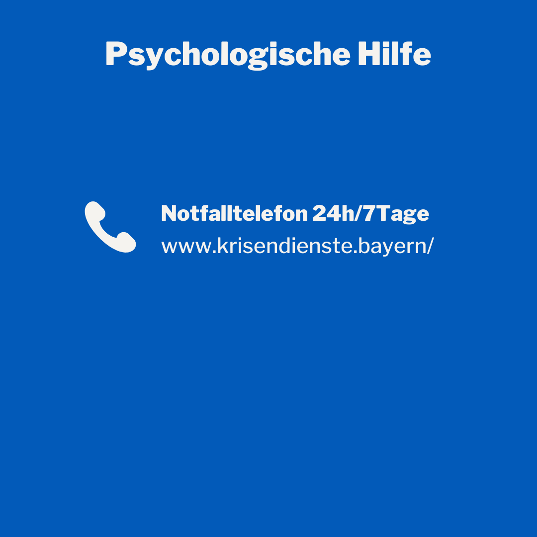 Die Krisendienste Bayern bieten erste Entlastung und Orientierung. Betroffene, Angehörige, Bezugspersonen und Hilfesuchende aus dem sozialen Umfeld werden fachkundig beraten und informiert. https://www.krisendienste.bayern/ - Telefon-Seelsorge: 0800 111 0 111 und 0800 111 0 222