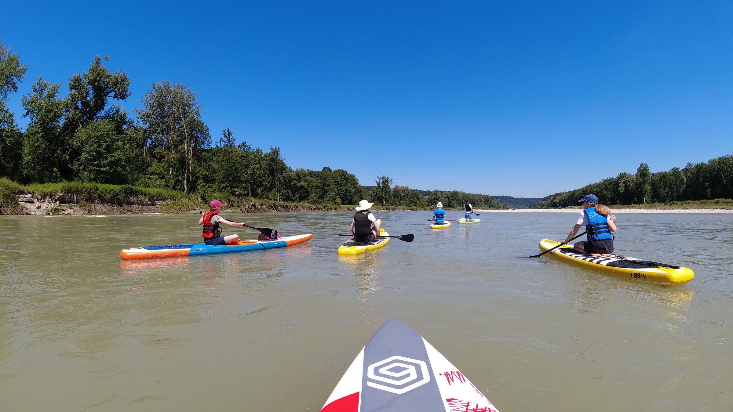 Am Samstag starteten wir nach dem Frühstück Richtung Tittmoning. Dort hieß es: rauf aufs SUP und rein ins Wasser! Zusammen mit vielen anderen Paddler*innen ging’s auf der Salzach zurück nach Burghausen – durch eine wunderschöne, renaturierte Flusslandschaft. Die Tour war stellenweise fordernd, aber die Stimmung top und ein echtes Highlight.