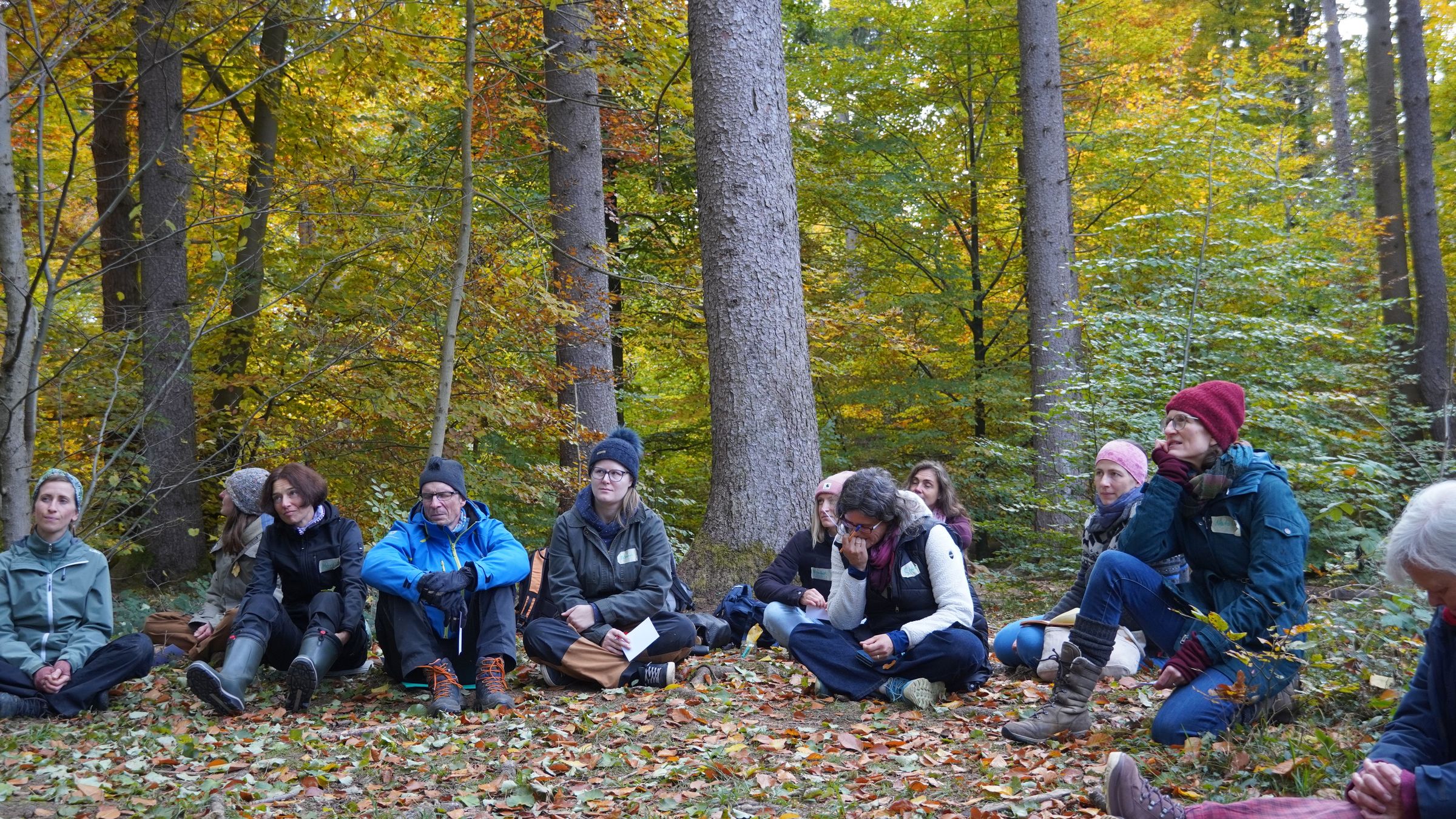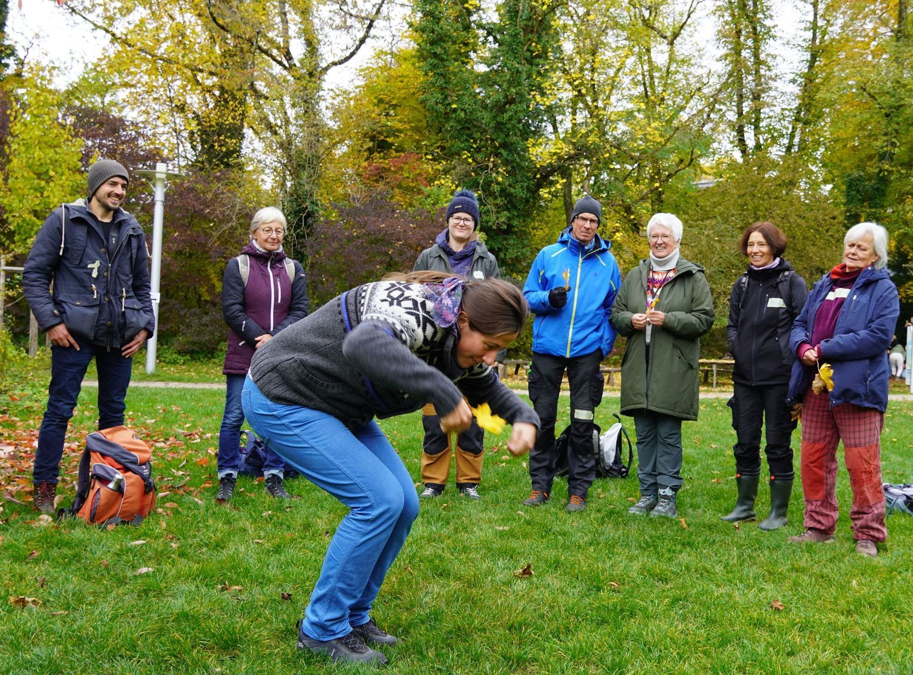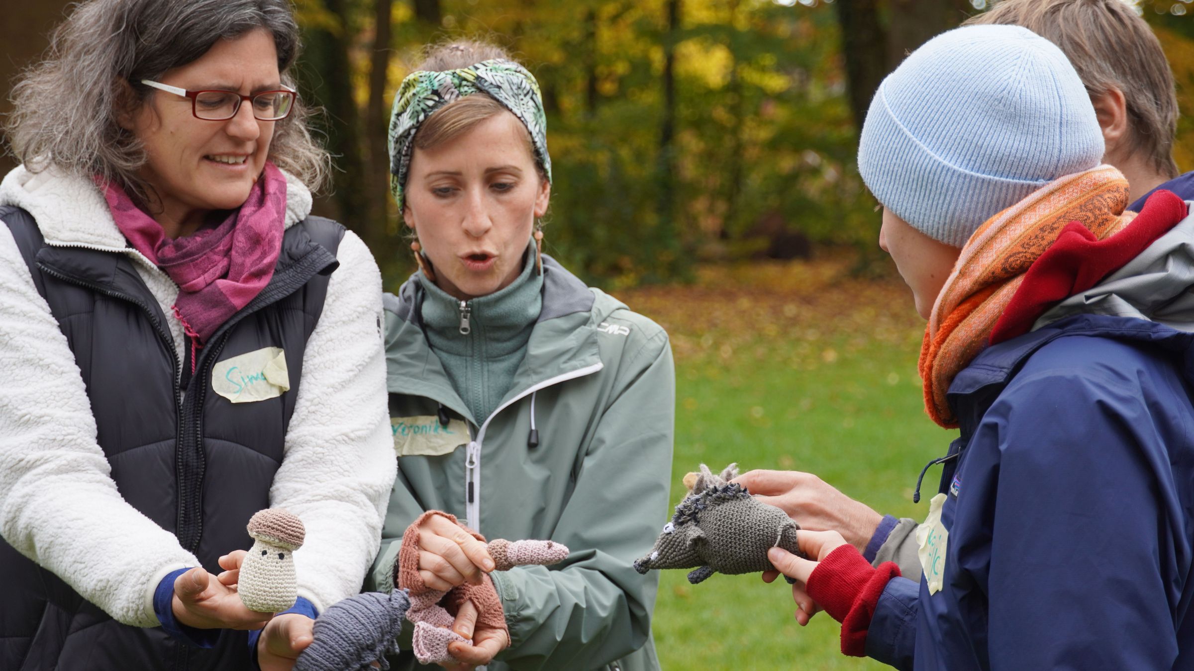 Menschen lieben Geschichten und so konnten die Teilnehmenden beim Geschichten spinnen mit Tier-Fingerpuppen kreativ werden, das wurde dramatisch oder sehr spaßig ausgelebt. Ein ruhiger, persönlicher Moment entstand, als sich alle einen Baum suchten und sich seine Geschichte erzählen ließen anhand seiner Wuchsform, Borkenwülsten, vom Blitz getroffenen Stämmen, eingeritzten Jahreszahlen und vieles mehr. Ein Gänsehaut-Moment war die Vielfalt und Kreativität der Geschichten als diese mit der Gruppe geteilt wurden.