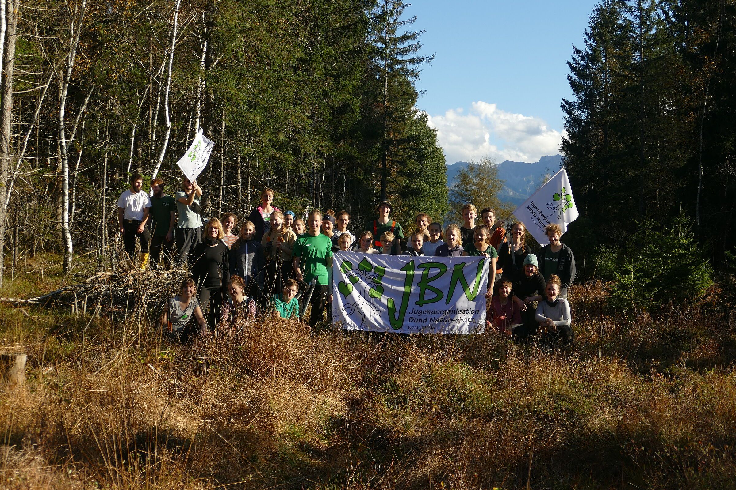 Nach der Ankunft und dem Bezug der urig gehaltenen Hütte gab es ein zünftiges Abendessen und das gemeinsame Kennenlernen mit neugierigen Fragen, denn die Vorfreude auf den nächsten Tag war groß. Der Wecker klingelte am Samstag bereits früh, denn es war mehr Arbeit vorhanden als an einem Tag zu schaffen war. Bewaffnet mit Astscheren und Arbeitshandschuhen zogen wir ins Moor; eine Naturlandschaft, der als wichtige CO2-Senke eine ganz besondere Bedeutung im Klimaschutz zukommt. Unter der fachkundigen Anleitung von Alfred und Simon, welche beide aus der BUND Naturschutz Kreisgruppe Kempten-Oberallgäu stammen, schnitten wir im Groß-Moos auf einer Fläche die jungen Büsche ab und bauten große Häufen. Im Fachjargon war unsere wertvolle Arbeit die "Entbuschung zur Förderung der moortypischen Vegetation", denn seit der Industrialisierung wurden Moore trockengelegt, um zum Beispiel Torf als Brennstoff zu gewinnen oder die nassen Wiesen trocken zu legen und als Viehweiden nutzen zu können. Seitdem die Flächen trocken gefallen sind, konnten sich Büsche und Fichten ansiedeln. Durch den Rückschnitt der Gehölze und das anschließende Abdichten der Entwässerungsgräben werden die Moorflächen in den Zustand vor der Zerstörung versetzt und ohne Büsche bekommen die Torfmoose und andere Pflanzenspezialisten des Moors wieder genügend Sonnenlicht um prächtig zu gedeihen.
